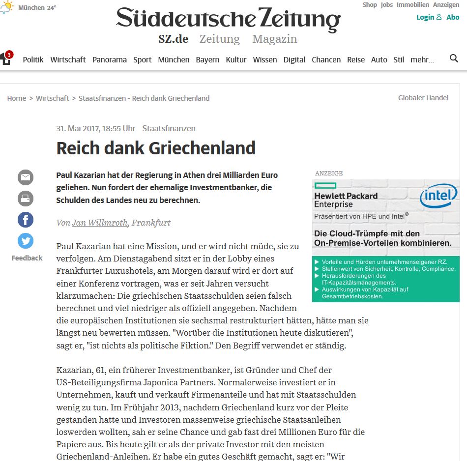 Σε ρεπορτάζ της η Süddeutsche Zeitung του Μονάχου αναφέρεται στις απόψεις του παρόντος στην ημερίδα Paul Kazarian αμερικανός μεγαλοεπενδυτής, πρώην τραπεζίτης της Goldman Sachs και ιδιοκτήτης της Japonica Partners που έχει επενδύσει εν μέσω της κρίσης σε ελληνικά ομόλογα.