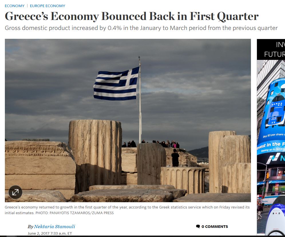 Η ελληνική οικονομία επέστρεψε στην ανάπτυξη το πρώτο τρίμηνο του έτους, σύμφωνα με την ελληνική στατιστική υπηρεσία, η οποία την Παρασκευή 2 Ιουνίου 2017 αναθεώρησε τις αρχικές εκτιμήσεις της.
