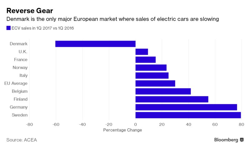 Οι πωλήσεις ηλεκτρικών αυτοκινήτων στη Δανία υποχώρησαν κατά 60,5% το πρώτο τρίμηνο του έτους, σε σύγκριση με τους τρεις πρώτους μήνες του 2016, σύμφωνα με τα τελευταία στοιχεία της Ευρωπαϊκής Ένωσης Κατασκευαστών Αυτοκινήτων.