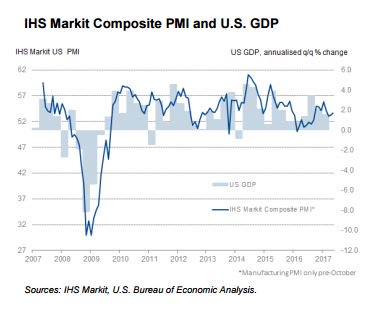 Ειδικότερα, ο δείκτες (λαμβάνουν υπόψη την απασχόληση, τα έσοδα κλπ) επιχειρηματικής δραστηριότητας της Markit για τον κλάδο των Υπηρεσιών ανήλθε στις 53,6 μονάδες τον Μάιο του 2017 (έναντι 53,1 τον Απρίλιο), όσο και ο σύνθετος PMI (περιλαμβάνει μεταποίηση, υπηρεσίες κλπ), έναντι 53,2 μονάδων τον Απρίλιο του ιδίου έτους.
