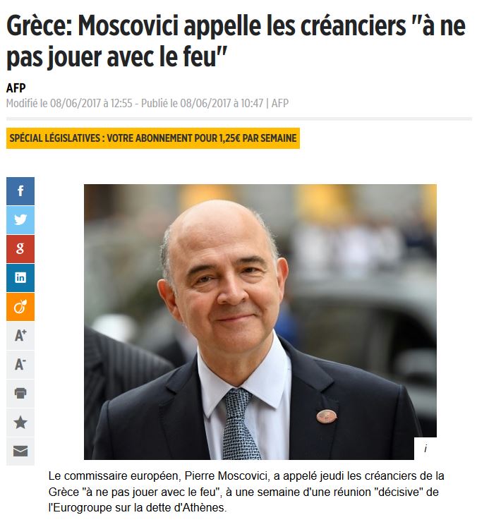 Έκκληση «στους δανειστές της Ελλάδας, να μην παίζουν με τη φωτιά», απηύθυνε ο Ευρωπαίος Επίτροπος Moscovici κατά τη διάρκεια συνέντευξης Τύπου που έδωσε σήμερα 8 Ιουνίου 2017 για όλα τα θέματα ευρωπαϊκής επικαιρότητας (άμυνα, περιβάλλον, μέλλον ευρωζώνης, εμπόριο), στη μόνιμη αντιπροσωπεία της Κομισιόν, στο Παρίσι.