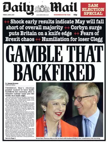 Εντονα επικριτική και η βρετανική Daily Mail η οποία κάνει λόγο για "ρίσκο που απέτυχε" υπονοώντας οτι είχε ως "θύμα" την ίδια τη May.