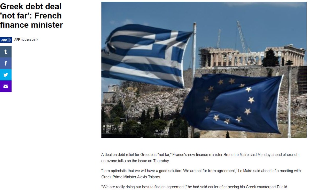 Μία συμφωνία για την ελάφρυνση του χρέους της Ελλάδα δεν είναι "πολύ μακριά", δήλωσε ο νέος υπουργός Οικονομικών της Γαλλίας, Bruno Le Maire σήμερα Δευτέρα 12 Ιουνίου 2017 λίγς ημέρες πριν από το Eurogroup στις 15 Ιουνίου αναφέρει σε δημοσίευμά του το AFP.