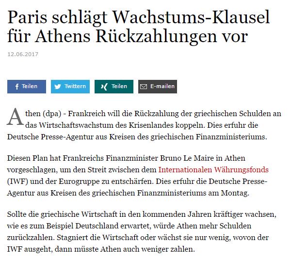 Πάντως, παρά την πρόταση Le Maire, για την SZ, το κρίσιμο σημείο των διαπραγματεύσεων στις διαπραγματεύσεις και αυτή την εβδομάδα παραμένει η στάση του Δ.Ν.Τ., δεδομένων των διαφορών που συνεχίζουν να χωρίζουν τον Wolfgang Schaeuble από το Δ.Ν.Τ..