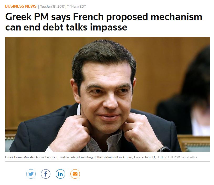 Ο Έλληνας πρωθυπουργός Αλέξης Τσίπρας, δήλωσε την Τρίτη 13 Ιουνίου 2017 στο υπουργικό συμβούλιο ότι η γαλλική πρόταση για έναν αυτόματο μηχανισμό σύνδεσης των μεσοπρόθεσμων μέτρων για το χρέος με την ανάπτυξη είναι "κλειδί" ώστε να γεφυρωθούν οι διαφορές μεταξύ θεσμών και αποτελεί μια δίκαιη πρόταση που σέβεται τις επιφυλάξεις όλων των πλευρών και δημιουργεί τους όρους για την οριστική υπέρβαση της κρίσης αναφέρει το πρακτορείο Reuters σε δημοσίευμά του.