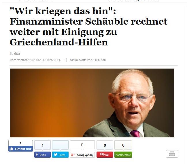 Να σημειωθεί ότι χθες 13 Ιουνίου 2017 ολ Γερμανός υπουργός Οικονομικών δήλωσε πως είναι πεπεισμένος ότι η Ελλάδα και οι διεθνείς πιστωτές θα καταλήξουν σε μια συμβιβαστική συμφωνία αυτή την εβδομάδα, κάτι που θα αποδεσμεύσει περισσότερα δάνεια για την Αθήνα.