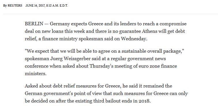 Η Γερμανία αναμένει από την Ελλάδα και τους δανειστές της να καταλήξουν σε συμβιβαστική συμφωνία στο Eurogroup στις 15 Ιουνίου και δεν υπάρχει εγγύηση ότι η Αθήνα θα πάρει ελάφρυνση του χρέους, δήλωσε ο εκπρόσωπος του Γερμανικού υπουργείου Οικονομικών σύμφωνα με δημοσίευμα του πρακτορείου Reuters.
