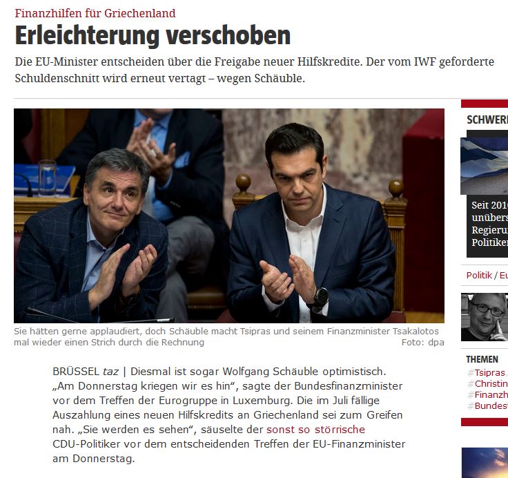 Αυτή τη φορά ακόμη και ο W. Schaeuble είναι αισιόδοξος για το Eurogroup στις 15 Ιουνίου 2017 που θα ασχοληθεί με το ελληνικό ζήτημα αναφέρει σε δημοσίευμά της η γερμανική εφημερίδα Taz.