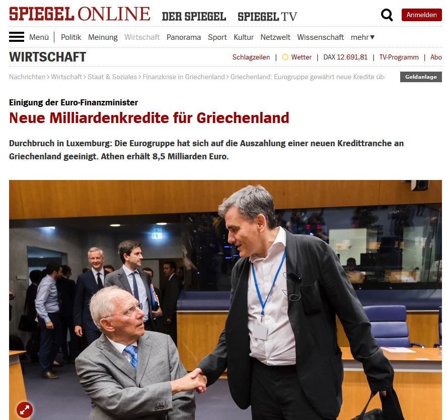 Το Eurogroup αποφάσισε την εκταμίεση δόσης 8,5 δισ. ευρώ αναφέρει σε δημοσίευμά του το γερμανικό Spiegel.
