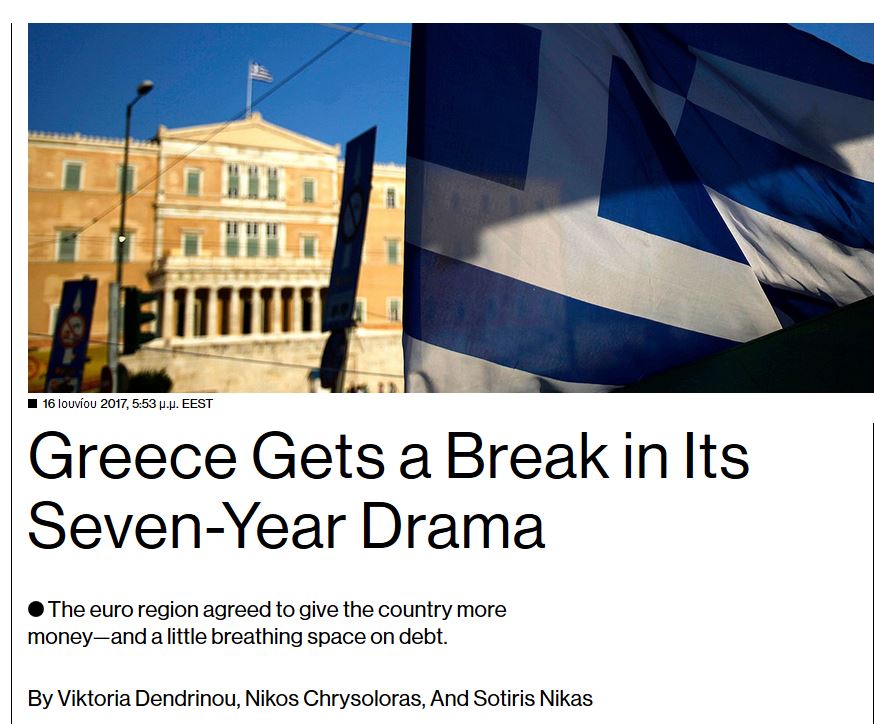 Οι υπουργοί οικονομικών της Ευρωζώνης ενέκριναν την Πέμπτη 15 Ιουνίου 2017 την εκταμίευση δόσης 8,5 δισ. ευρώ προς την Ελλάδα και το πιο χρεωμένο κράτος της Ευρωζώνης εξασφάλισε από τους πιστωτές του ότι θα φροντίσουν να καταστεί βιώσιμο το χρέος της Ελλάδας αναφέρει σε δημοσίευμά του το Bloomberg.