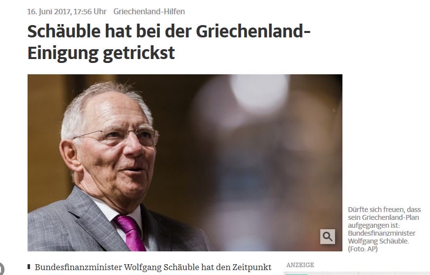 Όπως αναφέρει το δημοσίευμα ο Γερμανός υπουργός Οικονομικών φάινεται να βγαίνει κερδισμένος καθώς το Eurogroup χθες (15/6) αποφάσισε την εκταμίευση δόσης 8,5 δισ. ευρώ προς την Ελλάδα.