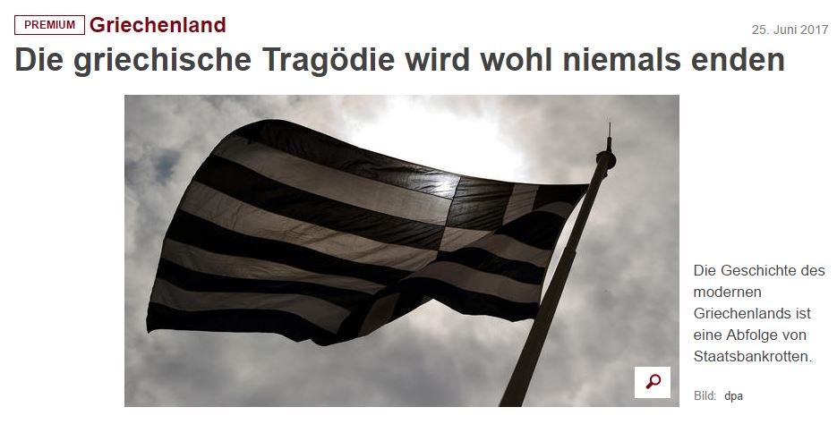 «Το ελληνικό δράμα είναι γνώριμο: Οι προτροπές για εφαρμογή λιτότητας από τον υπουργό Οικονομικών της Γερμανίας, Wolfang Schaeuble, η αγανακτισμένη αντίδραση της Ελλάδας και το αίτημα για ελάφρυνση του χρέους, τα ενθουσιώδη πρωτοσέλιδα του ελληνικού τύπου και τέλος: