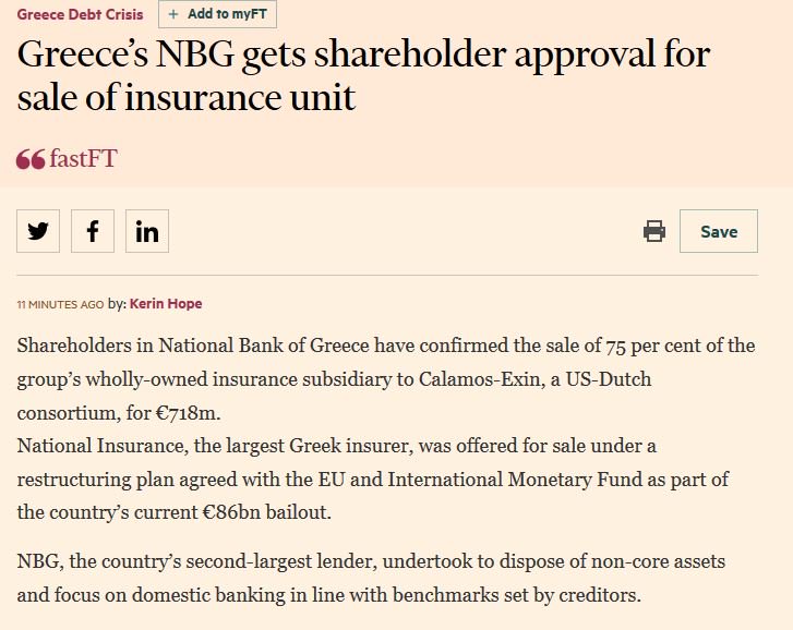 Η Γενική Συνέλευση των μετόχων της Εθνικής Τράπεζας έδωσε την έγκρισή της στην πώληση του 75% της Εθνικής Ασφαλιστικής στην κοινοπραξία Calamos-Exin, έναντι 718 εκατ. ευρώ αναφέρουν σε δημοσίευμά τους οι Financial Times.