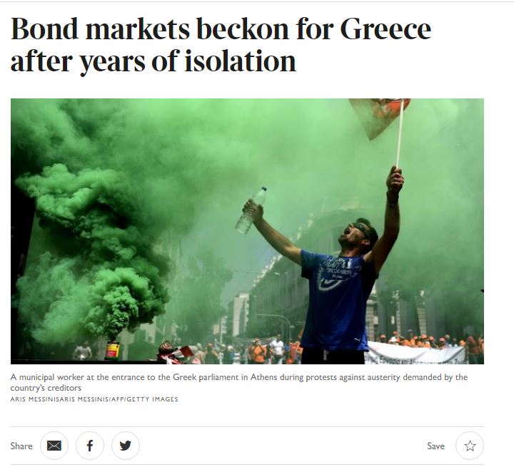 «Το πότε ακριβώς θα γίνει η επιστροφή στις αγορές παραμένει ασαφές, αλλά πολλοί αξιωματούχοι εντός της αριστερής κυβέρνησης του Αλέξη Τσίπρα προτείνουν ότι η Ελλάδα θα μπορούσε να εκδώσει ομόλογα εντός των εβδομάδων, που θα είναι η πρώτη (έκδοση) έπειτα από μια αποτυχημένη προσπάθεια το 2014» επισημαίνεται στο ίδιο δημοσίευμα.