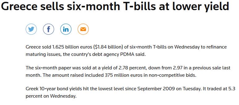 Το ελληνικό δημόσιο άντλησε σήμερα 5 Ιουλίου 2017 το ποσό των 1,625 δισ. ευρώ, κατά τη δημοπρασία εντόκων γραμματίων εξάμηνης διάρκειας, με μειωμένο επιτόκιο αναφέρει σε δημοσίευμά του το πρακτορείο Reuters.