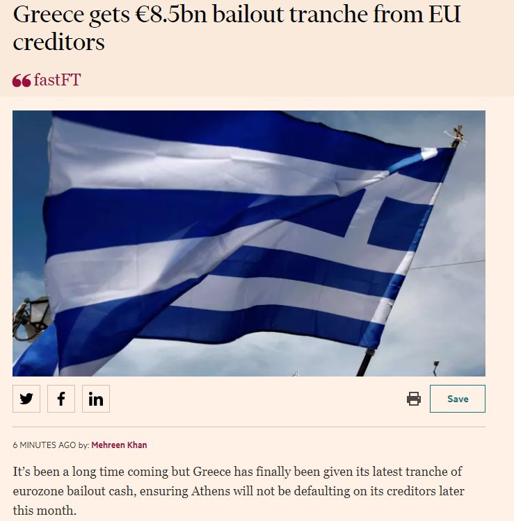 Η Ελλάδα έλαβε κεφάλαια -μετά από καιρό- από τους δανειστές της, καθώς ο Ευρωπαϊκό; Μηχανισμός Σταθερότητας (ESM) ενέκρινε σήμερα (7 Ιουλίου 2017) τη δόση ύψους 8,5 δισ. ευρώ προς την Αθήνα, μετά και την ολοκλήρωση της β’ αξιολόγησης του τρέχοντος προγράμματος συνολικού ύψους 86 δισ. ευρώ, σχολιάζουν οι Financial Times, τονίζοντας ότι η μεσογειακή χώρα δε θα χρεοκοπήσει τον Ιούλιο του 2017.