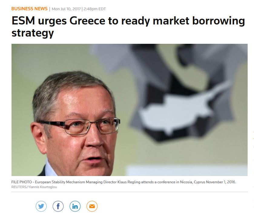 Η Ελλάδα πρέπει να αναπτύξει μια στρατηγική για την επιστροφή της στις αγορές δανείων πριν από την ολοκλήρωση του τρέχοντος προγράμματος διάσωσης που ολοκληρώνεται τον Αύγουστο του 2018, τόνισε ο επικεφαλής του ESM Klaus Regling σε δηλώσεις του μετά την ολοκλήρωση του σημερινού (10/7) Eurogroup όπως αναφέρει σε δημοσίευμά του το πρακτορείο Reuters.