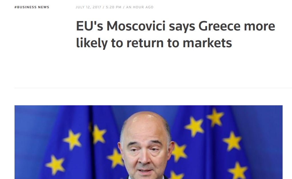 Ο αρμόδιος για τις οικονομικές υποθέσεις επίτροπος, Moscovici, χαιρέτησε με δηλώσεις του προς τους εκπροσώπους του Τύπου, την έξοδο της Ελλάδας από τη διαδικασία ελέγχου, την οποία επιβάλλουν οι Βρυξέλλες στις χώρες που εμφανίζουν υπερβολικά επίπεδα δημοσιονομικού ελλείμματος όπως αναφέρει δημοσίευμα του πρακτορείου Reuters.