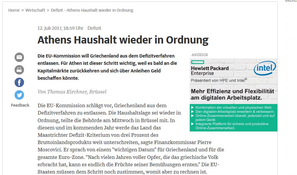 Στην απόφαση της Κομισιόν να συστήσει στο Συμβούλιο να κλείσει τη διαδικασία υπερβολικού ελλείμματος για την Ελλάδα αναφέρεται δημοσίευμα της η γερμανική εφημερίδα Suddeutsche Zeitung.