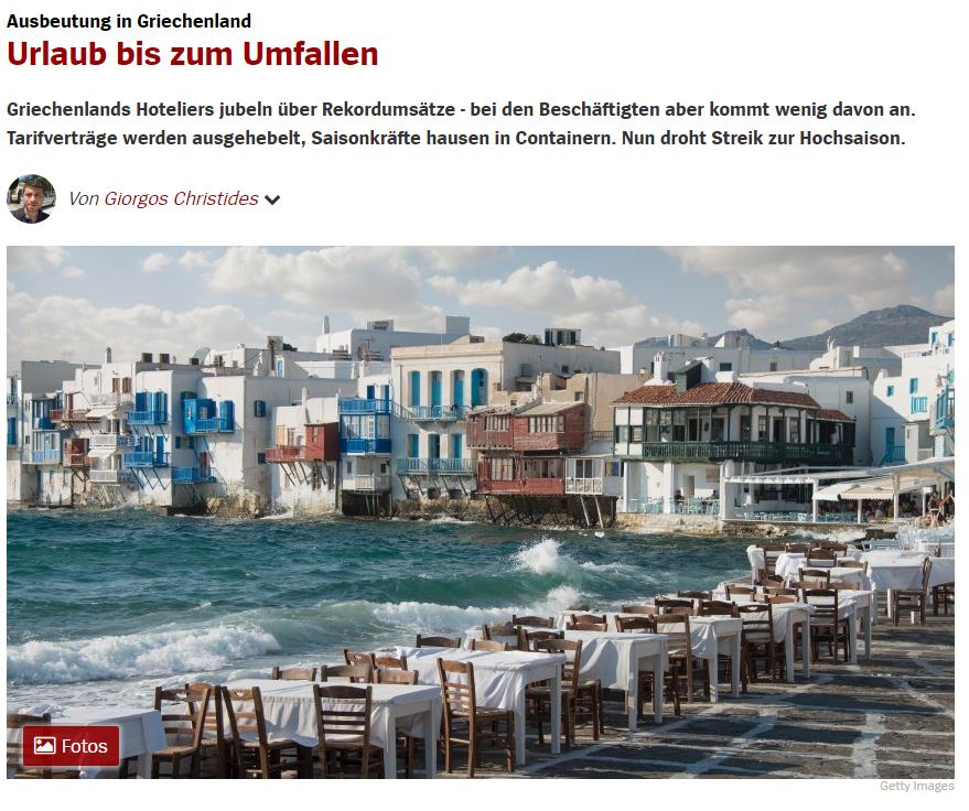 Μετά το τηλεοπτικό ρεπορτάζ που παρουσίασε προ ημερών το πρώτο κανάλι της γερμανικής δημόσιας τηλεόρασης ARD κάνοντας λόγο για φαινόμενα σύγχρονης δουλείας στον ελληνικό τουρισμό, άλλο ένα δημοσίευμα του γερμανικού Τύπου επιχειρεί να φωτίσει αυτή τη σκοτεινή πλευρά της τουριστικής ανάπτυξης στην Ελλάδα.