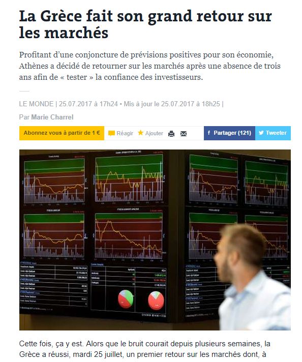 Για την Αθήνα η έκδοση του πενταετούς ομολόγου ήταν μία δοκιμασία, έπρεπε να προετοιμάσει την επιστροφή της στις αγορές, η οποία θεωρητικά θα πραγματοποιηθεί το 2018, όταν η Ελλάδα θα εξέλθει του τρίτου προγράμματος διάσωσης, ύψους 86 δισ.ευρώ, το οποίο συμφωνήθηκε το καλοκαίρι του 2015, αναφέρει η Le Monde.
