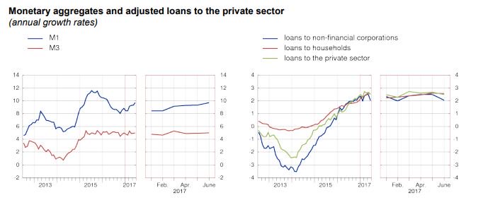 Ο ετήσιος ρυθμός ανάπτυξης του δείκτη M1 αυξήθηκε στο +9,7% τον Ιούνιο, από +9,3% τον Μάιο.