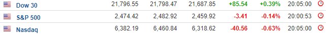 Αντίθετα, ο βιομηχανικός Dow Jones Industrial Average έκλεισε με νέο ιστορικό ρεκόρ, στις 21.796,5 μονάδες, ενισχυμένος κατά 0,39% σε ημερήσια βάση, ενώ ο δείκτης – βαρόμετρο S&P 500 τερμάτισε με οριακή υποχώρησε 0,14%, στις 2.474,4 μονάδες.