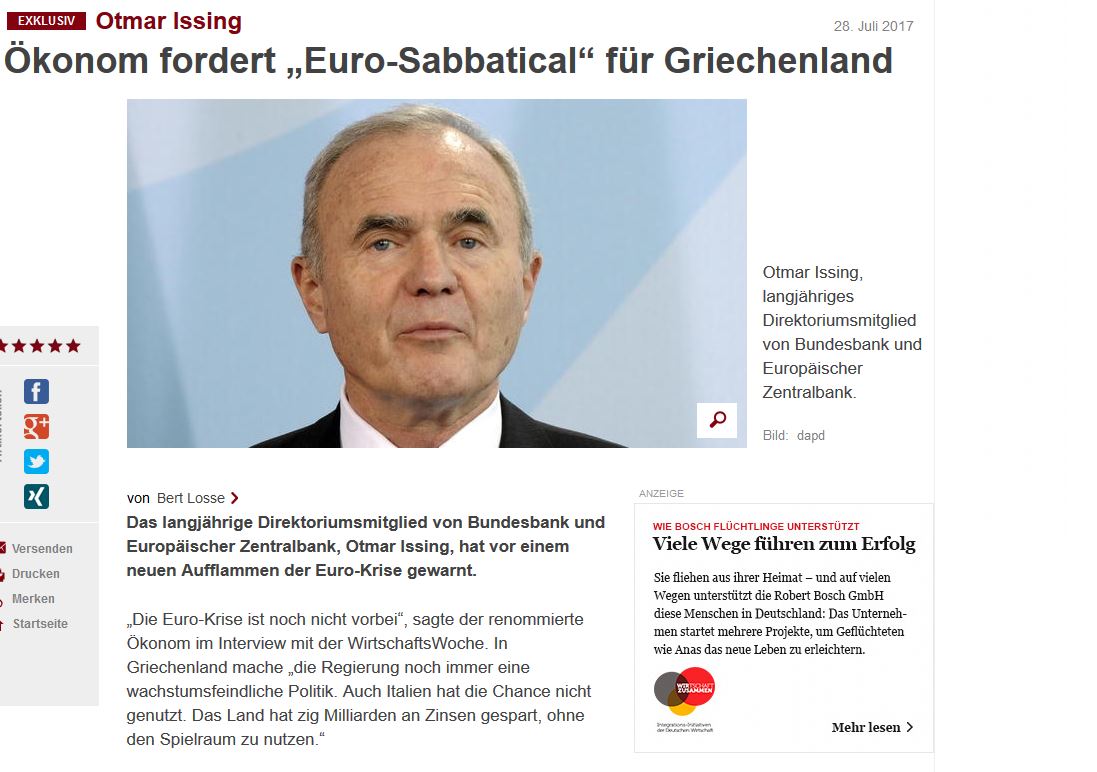 Παράλληλα θα πρέπει να εξαρτηθεί η επανένταξή τους στη ζώνη του ευρώ από τα θεμελιώδη μεγέθη και τις μεταρρυθμίσεις", λέει ο Issing στο Wirtschafts Woche.