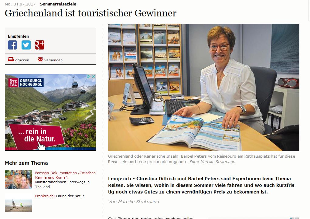 Εν μέσω της τουριστικής περιόδου τα θετικά δημοσιεύματα του γερμανικού τύπου για την Ελλάδα αποτελούν τον κανόνα. «Η Ελλάδα είναι η νικήτρια στον τουρισμό» είναι ο τίτλος άρθρου στην εφημερίδα Westfälische Nachrichten που εξετάζει ποιες είναι οι καλύτερες επιλογές για φέτος το καλοκαίρι για τους Γερμανούς τουρίστες, ακόμη και εκείνους που δεν έχουν κανονίσει ακόμη κάποιο ταξίδι.