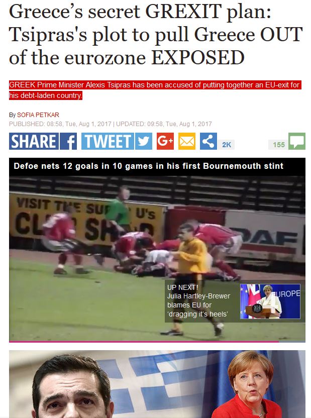 Ο Έλληνας Πρωθυπουργός Αλέξης Τσίπρας κατηγορείται ότι είχε σχέδιο εξόδου της χώρας από την Ευρώζώνη αναφέρει δημοσίευμά της βρετανικής εφημερίδας Express, η οποία επικαλείται δημοσιεύμτα του ελληνικού Τύπου ότι ο κ. Τσίπρας συναντήθηκε με αξιωματούχους της Βενεζουέλας στη Μόσχα το 2013 για να συζητήσει πιθανή βοήθεια από τη σοσιαλιστική κυβέρνηση της χώρας σε περίπτωση αποχώρησης από την ευρωζώνη.
