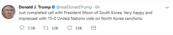 Πολύ χαρούμενος και εντυπωσιασμένος με τις ψήφους 15-0 των Ηνωμένων Εθνών με κυρώσεις για τη Βόρεια Κορέα», έγραψε στο Twitter o Trump.