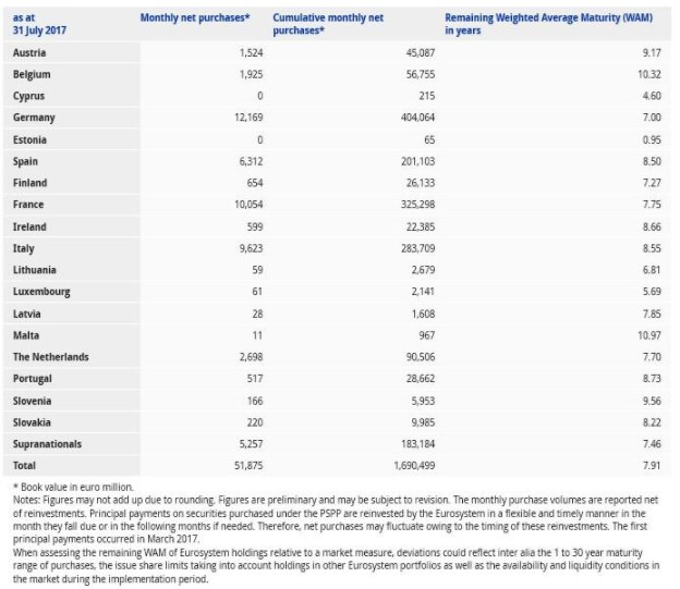 Όπως φαίνεται και στον παρακάτω πίνακα, τα περισσότερα ομόλογα που αγοράστηκαν ανά χώρα της Ευρωζώνης ήταν γερμανικά, ήτοι 12,1 δισ. ευρώ, ενώ δεν υπήρξαν αγορές σε περιουσιακά της Εσθονίας και της Κύπρου.