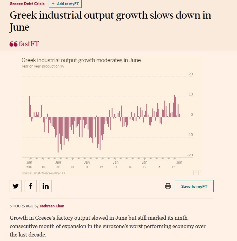 Παρά το γεγονός ότι παρουσίασε σημάδια επιβράδυνησης συνεχίστηκε η ανάπτυξη του Γενικού Δείκτη Βιομηχανικής Παραγωγής στην Ελλάδα τον Ιούνιο του 2017 αναφέρουν σε δημοσίευμά τους οι Financial Times.