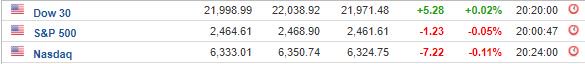 Έτσι, ο Dow Jones Industrial average ενισχύθηκε μόλις κατά 0,02%, στις 21.999,36 μονάδες, ο S&P 500 κατέγραψε απώλειες 0,05% και έκλεισε στις 2.464,61 μονάδες, ενώ ο Nadaq έκλεισε κατά 0,11% χαμηλότερα, στις 6.333,01 μονάδες.
