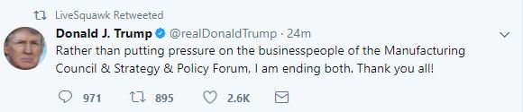Στη διάλυση δύο συμβουλευτικών ομάδων Αμερικανών επιχειρηματικών ηγετών ανακοίνωσε σήμερα (16/8/2017) ότι προχωρά ο Donald Trump στον απόηχο των μαζικών παραιτήσεων CEOs, που αντιδρούν στη «χλιαρή» αντιμετώπιση από τον πρόεδρο των ΗΠΑ των βίαιων ρατσιστικών επεισοδίων στη Βιρτζίνια κατά τη διάρκεια του σαββατοκύριακου.