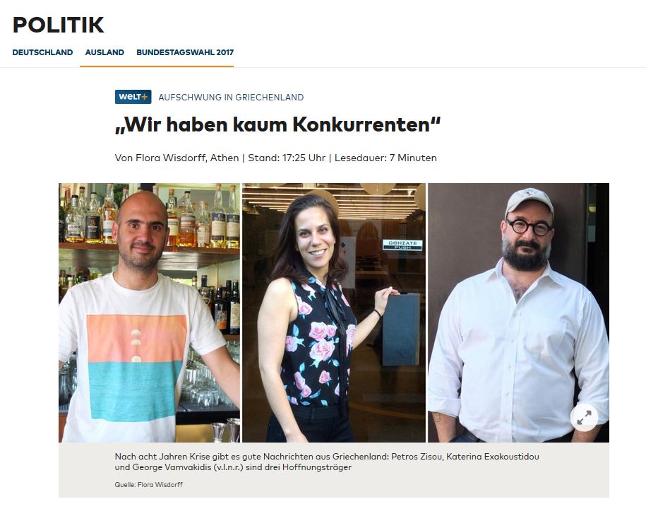 «Μετά από οκτώ έτη κρίσης, υπάρχουν καλά νέα από την Αθήνα: η οικονομία ανακάμπτει και οι Έλληνες αξιοποιούν τη δυναμική της», γράφει σε σημερινό της δημοσίευμα η έντυπη έκδοση της γερμανικής εφημερίδα Die Welt.