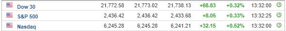 Περί τις 16:30, ο Dow Jones Industrial average ενισχυόταν κατά 0,32%, στις 21.772,58 μονάδες, ο S&P 500 κατέγραφε κέρδη 0,32% και κινείτο στις 2.436,18 μονάδες, ενώ ο Nasdaq κινείτο κατά 0,48% υψηλότερα, στις 6.242,75 μονάδες.