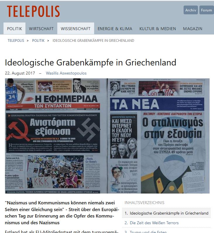 Ο ναζισμός και ο κομμουνισμός δεν μπορούν ποτέ να είναι δύο όψεις μιας εξίσωσης αναφέρει σε δημοσίευμά της η γερμανική ιστοσελίδα Telepolis αναφερόμενη στη διαμάχη που έχει ξεσπάσει για την Ευρωπαϊκή Ημέρα στη μνήμη των θυμάτων του κομμουνισμού και του ναζισμού.