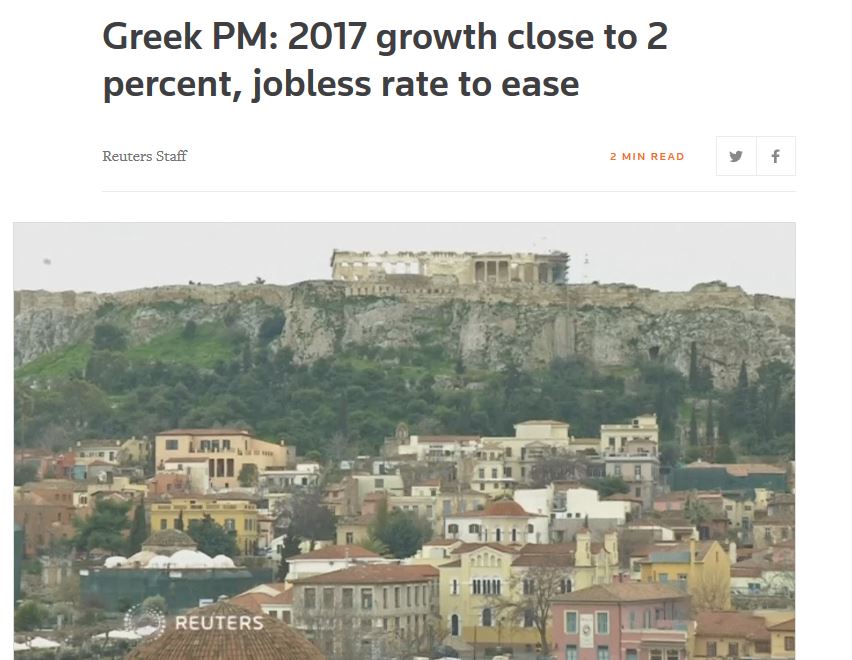 Η ελληνική οικονομία της Ελλάδας θα αυξηθεί φέτος (2017) κατά 2% περίπου και η ανεργία θα μειωθεί περαιτέρω το 2018, δήλωσε ο πρωθυπουργός Αλέξης Τσίπρας την Τρίτη (29/8), σε μια προσπάθεια να δείξει ότι η χώρα αλλάζει σελίδα μετά από επτά χρόνια κρίσης, αναφέρει σε δημοσίευμά του το πρακτορείο Reuters.