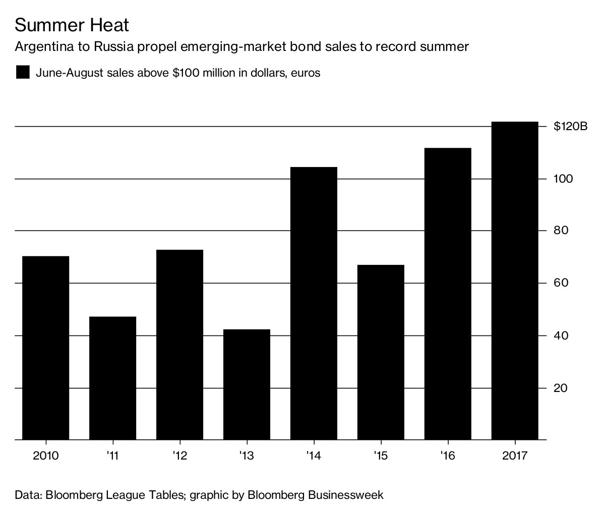 Σε ένα crescendo εκδόσεων ομολόγων προχώρησαν οι αναδυόμενες αγορές, μεταξύ των οποίων Αργεντινή, Ρωσία και Ινδονησία, κατά το τρίμηνο Ιουνίου-Αυγούστου 2017.