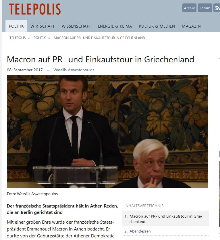 Τον γάλλο Πρόεδρο E. Macron περίμεναν μεγάλες τιμές κατά τη διάρκεια της επίσημης επίκσεψής του στην Ελλάδα, όπως αναφέρει σε δημοσίευμά της η γερμανική ιστοσελίδα Telepolis.
