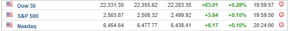 Έτσι, ο Dow Jones Industrial average ενισχύθηκε κατά 0,28%, στις 22.331,35 μονάδες, καταγράφοντας το 5ο συνεχόμενο ιστορικό υψηλό κλείσιμο, ο S&P 500 κατέγραψε κέρδη 0,15% και έκλεισε στις 2.503,87 μονάδες, ενώ ο Nasdaq έκλεισε κατά 0,10% υψηλότερα, στις 6.454,64 μονάδες, έχοντας προηγουμένως ανέλθει στο ενδοσυνεδριακό υψηλό των 6.477,77 μονάδων.