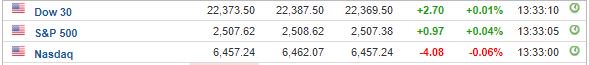 Έτσι, περί τις 16:30, ο Dow Jones Industrial average ενισχυόταν μόλις κατά 0,01%, στις 22.373,00 μονάδες, ο S&P 500 κατέγραφε κέρδη 0,03% και κινείτο στις 2.507,38 μονάδες, ενώ ο Nasdaq κινείτο κατά 0,09% χαμηλότερα, στις 6.455,22 μονάδες.