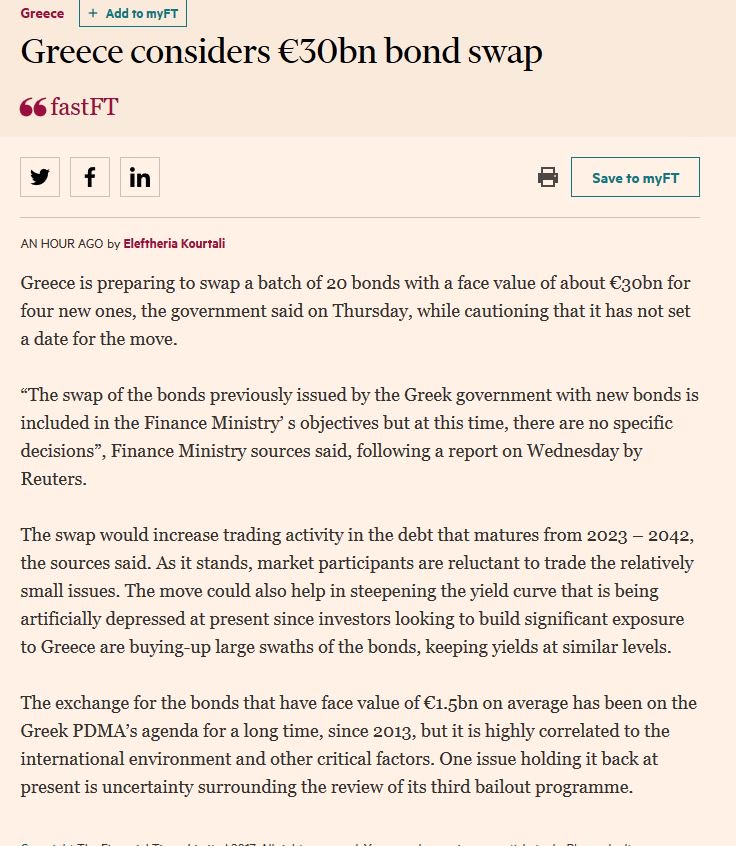 Η Ελλάδα σχεδιάζει να προχωρήσει σε swap 20 ομολόγων με ονομαστική αξία περίπου 30 δισ. ευρώ με την έκδοση τεσσάρων νέων ομολογιακών εκδόσεων σύμφωνα με δηλώσεις κυβερνητικών αξιωματούχων αναφέρουν οι Financial Times σε δημοσίευμά τους.