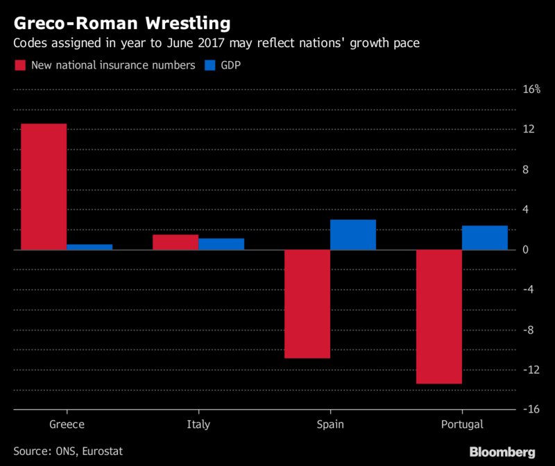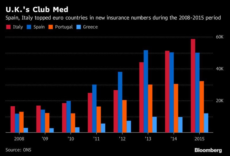 Σύμφωνα με στοιχεία από τη βρετανική στατιστική υπηρεσία (ONS), στο α’ εξάμηνο του τρέχοντος έτους 60.000 Ιταλοί και 15.000 Έλληνες έλαβαν τον επονομαζόμενο «ασφαλιστικό κωδικό», ο οποίος είναι απαραίτητος προκειμένου κάποιος να μπορέσει να εργαστεί στη Βρετανία.