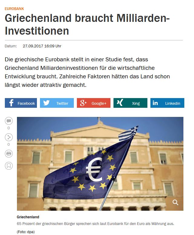 Στο τρίτο τεύχος της Επιθεώρησης Οικονομία & Αγορές για το 2017 που εξέδωσε σήμερα (27/9) η Eurobank η οποία αναλύει το πως η Ελλάδα θα μπορέσει να αποτελέσει ελκυστικό επενδυτικό προορισμό αναφέρεται σε δημοσίευμά της η γερμανική εφημερίδα Handelsblatt.