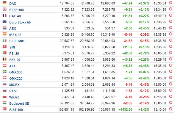 Στο Λονδίνο, ο FTSE 100 ενισχύθηκε κατά 0,13%, στις 7.322,82 μονάδες, ο DAX στη Φρανκφούρτη σημείωσε άνοδο 0,37% και έκλεισε στις 12.704,65 μονάδες, ενώ ο CAC 40 στο Παρίσι έκλεισε κατά 0,22% υψηλότερα, στις 5.293,77 μονάδες.
