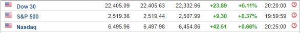 Ο Dow Jones Industrial average ενισχύθηκε κατά 0,11%, στις 22.405,09 μονάδες, ο S&P 500 κατέγραψε κέρδη 0,37% και έκλεισε στις 2.519,36 μονάδες, ενώ ο Nasdaq έκλεισε κατά 0,66% υψηλότερα, στις 6.495,96 μονάδες.