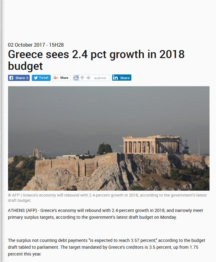 Σύμφωνα με το δημοσίευμα, το οποίο αναπαράγει τις εκτιμήσεις της Αθήνας, η ελληνική οικονομία θα ανακάμψει με ανάπτυξη 2,4% το 2018 και η χώρα θα κατορθώσει να επιτύχει τον στόχο του πρωτογενούς πλεονάσματος, το οποίο αναμένεται ότι θα φθάσει στο 3,57% του ΑΕΠ.