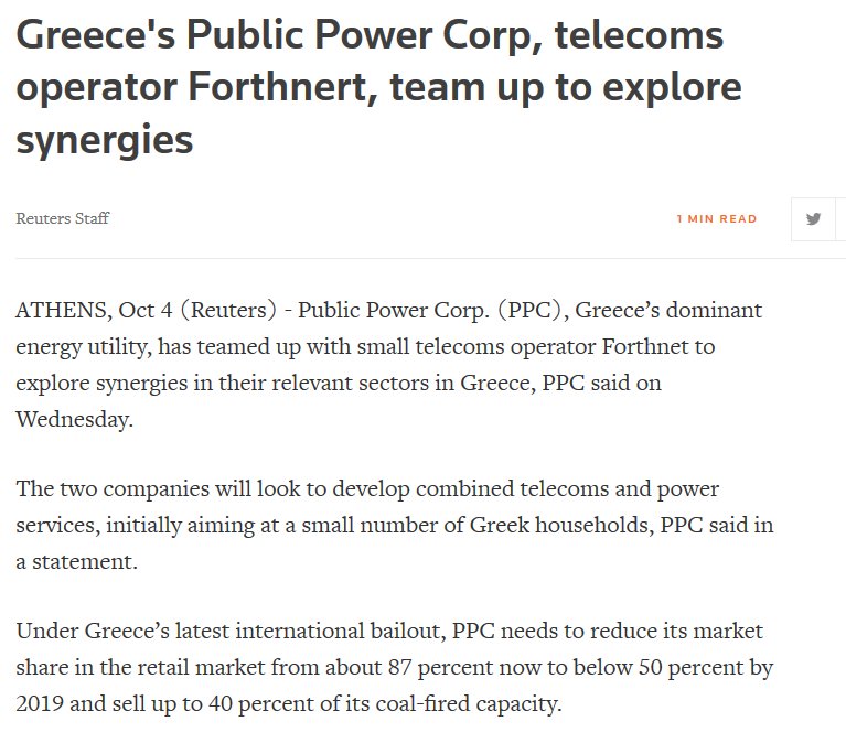 Στη συμφωνία μεταξύ της ΔΕΗ και της Forthnet αναφέρεται δημοσίευμα του πρακτορείου Reuters.